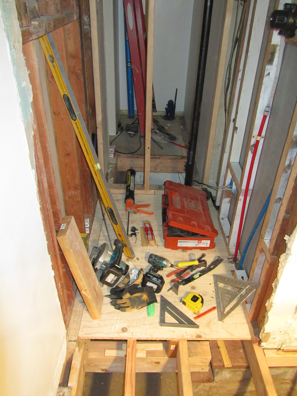I started the subfloor in the actual shower because it was the most difficult space. With all the rotten wood, I needed to try and slide the plywood under the bottom plates of the existing walls. I was a little surprised it went so well. And of course, like any project, as soon as i have a level, flat surface, it becomes a landing place for all my tools. It’s a terrible habit that I’ve yet to break. It definitely slows me down because I’m constantly moving stuff from one place to another.