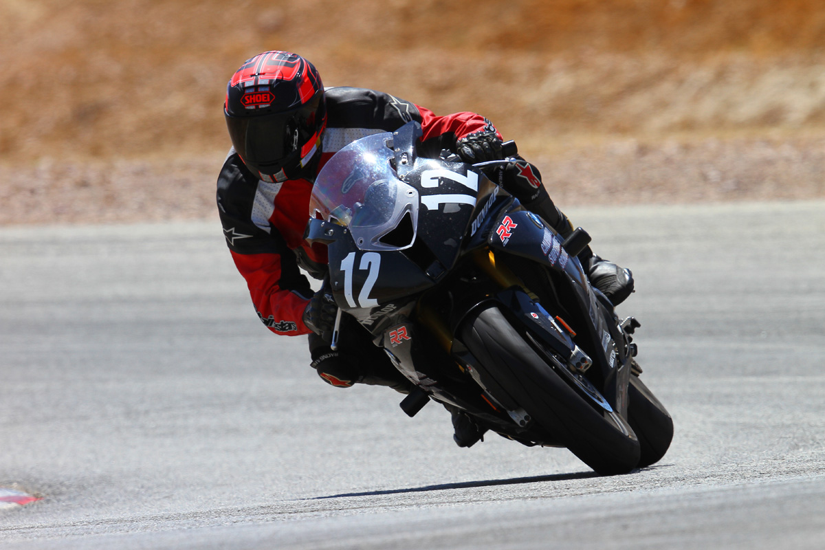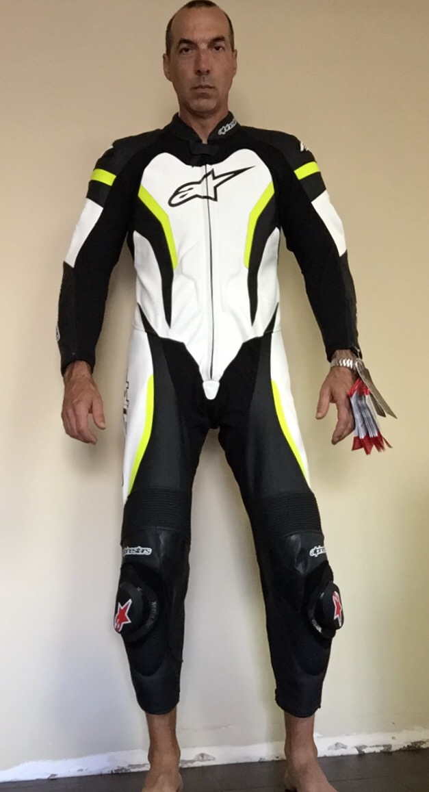 First topic up for discussion is Race Suit Fit. I’ve never owned a true race suit. I’ve got a jacket and leather pants that zip together for track use you can see it in this shot. Problem is, I bought it for street riding. It’s too big for the track. All that loose leather in the sleeves is bad, bad, bad when you crash as it can fold up on itself when you are sliding on the pavement.