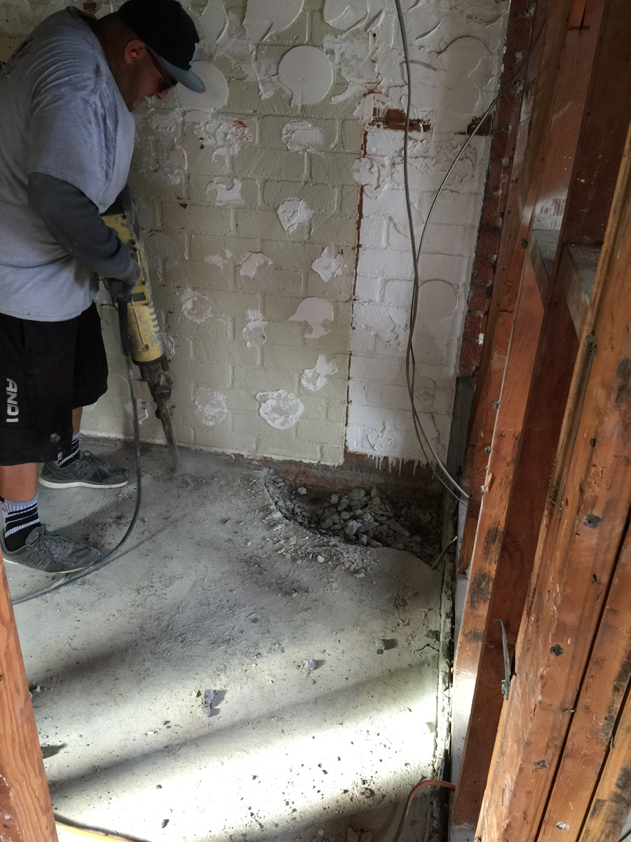 There is still lots of jack hammer work to do as well. There is nothing else that works effectively. The slab is poured right up to the chimney brick and the exterior stucco from when this used to be outside space in the home’s original configuration. Also, when the space was converted to interior, they poured a second slab over the first one to get the surface level!