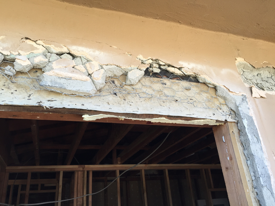 Concrete gains strength as it cures, and this stuff is miserable. I’ve beat on it with a hammer, chipped it with a chisel and demolished it with my Bosch Bulldog rotary hammer. The key to this task is to maintain the integrity of the waterproof barrier behind the stucco. Normally that would be relatively easy, but here in California, many houses are open-framed. There is no plywood or other sheathing on the exterior. So when you beat on the stucco, it just caves in the tar paper behind it. Every time you crack, tear or break the paper, the potential for water intrusion exists. In some areas, it doesn’t matter all that much. At the top of the wall, there is good weather protection under the eaves, so we would have to see real horizontal rain for that to be a problem.
