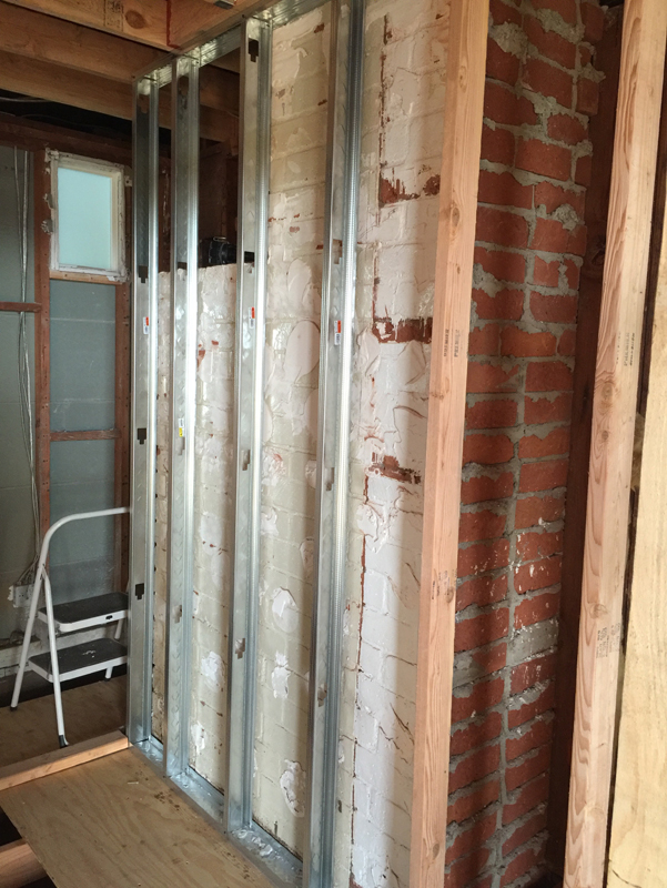 Code says that you can’t have wood framing against the brick of the chimney. It needs a 2-inch air space. I didn’t want to give up those two inches, so I had to learn how to frame the offending walls with steel studs.