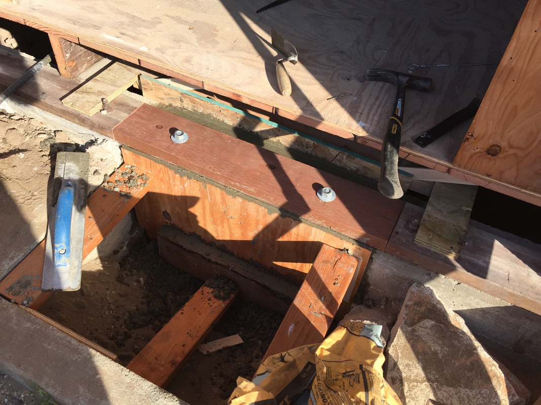 One advantage to the vast redwood forests in California, the lumber is easy to come by. So much so that it was common to use it for structural lumber where wood meets concrete. This is due to its natural insect and rot resistance. Today, we used pressure treated lumber for this job and save the redwood (and the money) for the places we want to look really pretty.