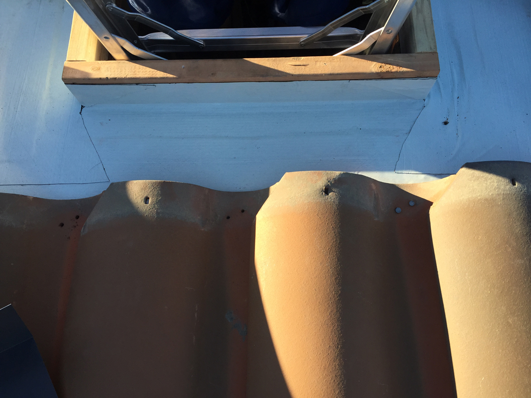 I had made a couple calls to roofing companies, including the company that installed the roof new several years ago. (Prior to the tile, we had a classic “tar and gravel” roof, where layers of tarpaper are put down with hot tar and then covered with sand and gravel to prevent the sun from breaking down the asphalt.) But with the threat of an El Nino winter looming, they were all busier than usual and nobody was very interested in a small job like this one.