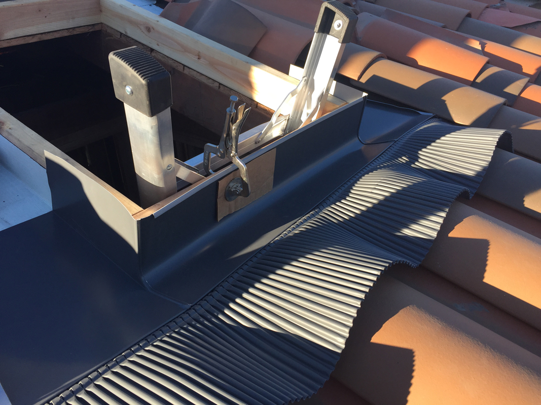 With the curbs installed, I was ready to move onto the aluminum flashing kit. Velux, the skylight manufacturer, makes a kit specifically for tile or high-profile roof materials with a corrugated, flexible bottom flashing that forms to the tile. It’s a must in a situation like this, but still a challenge to get it installed.