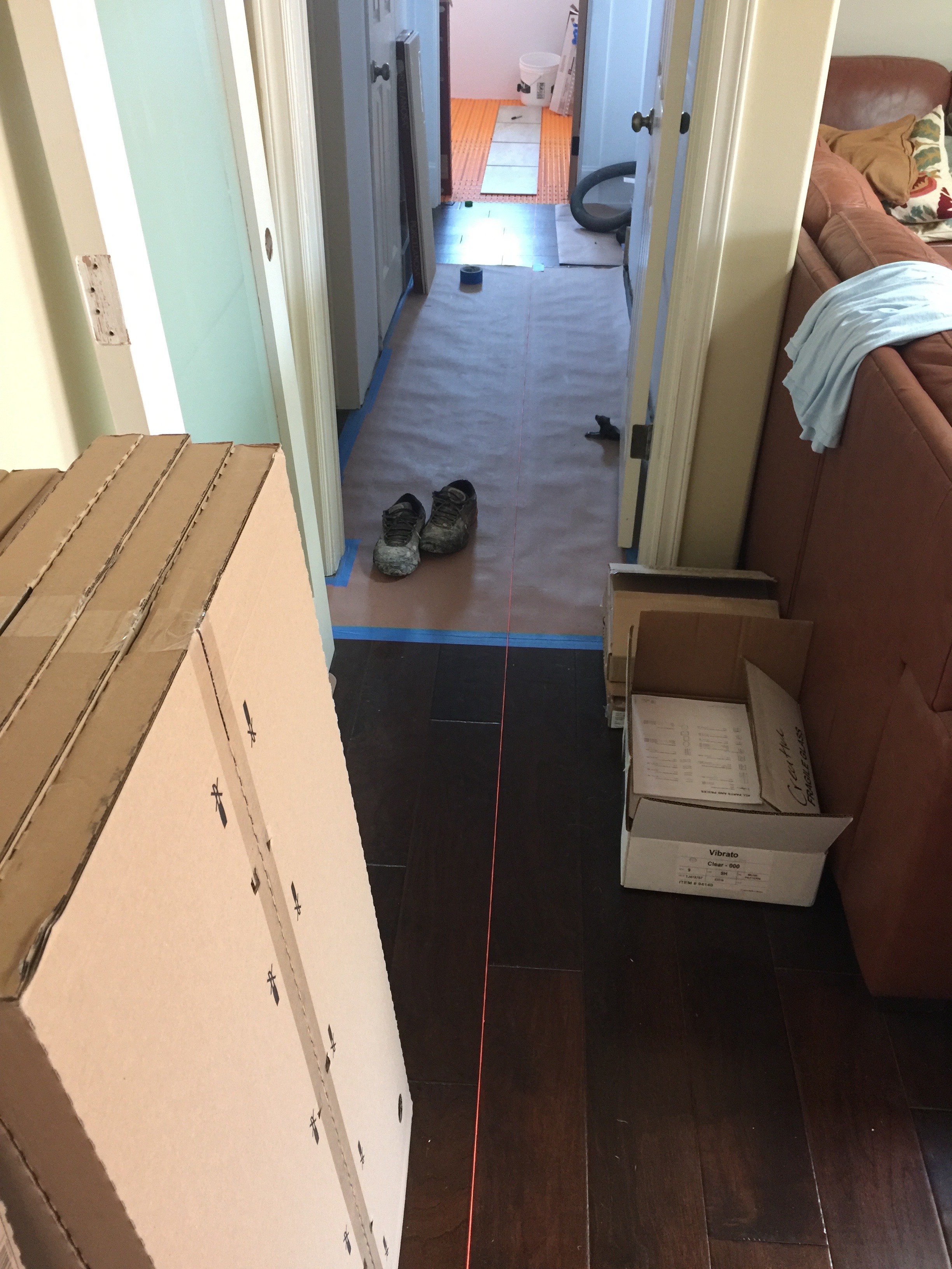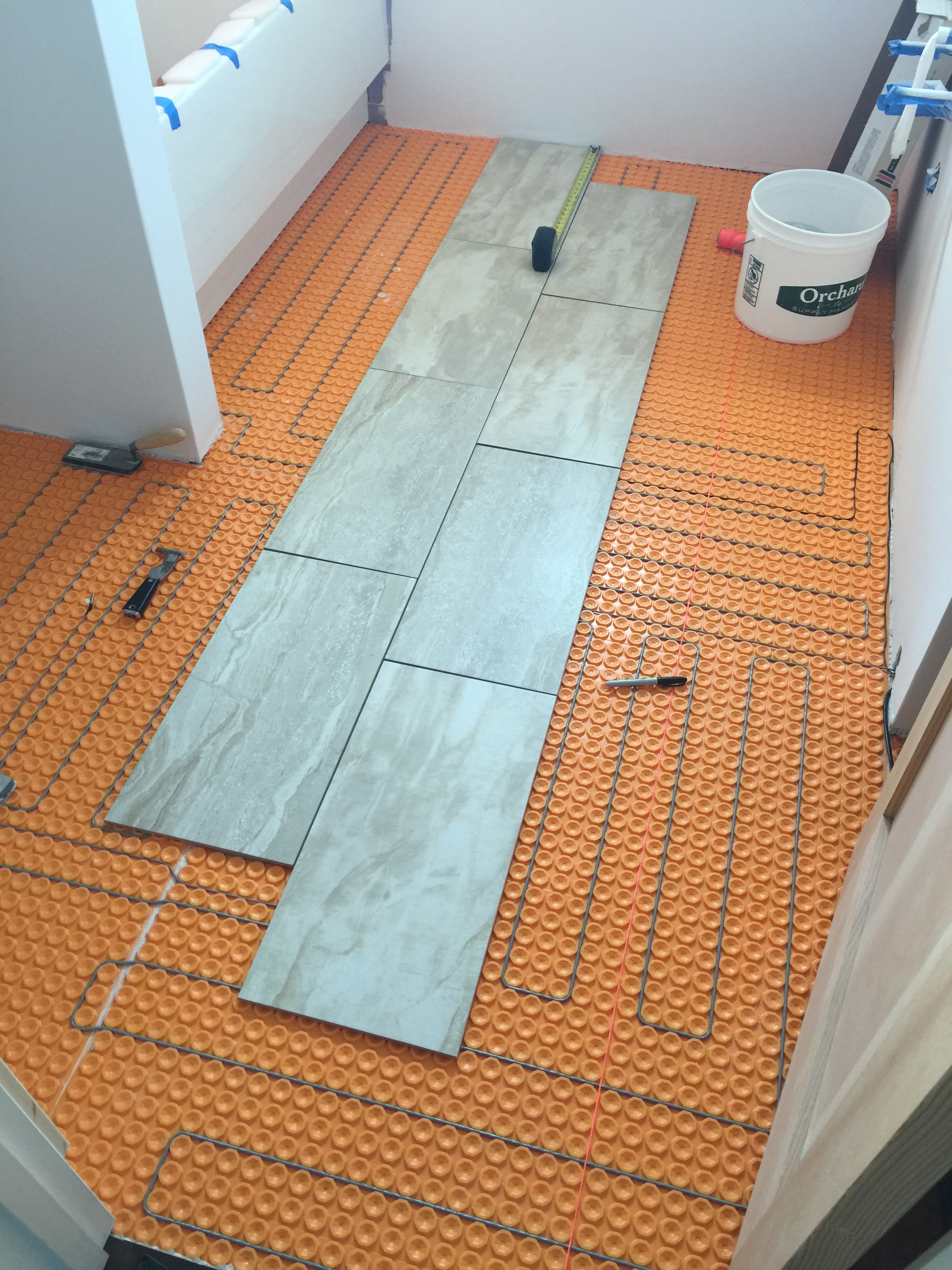The orange stringline establishes the line of the flooring, to use as a reference when beginning the tile layout.