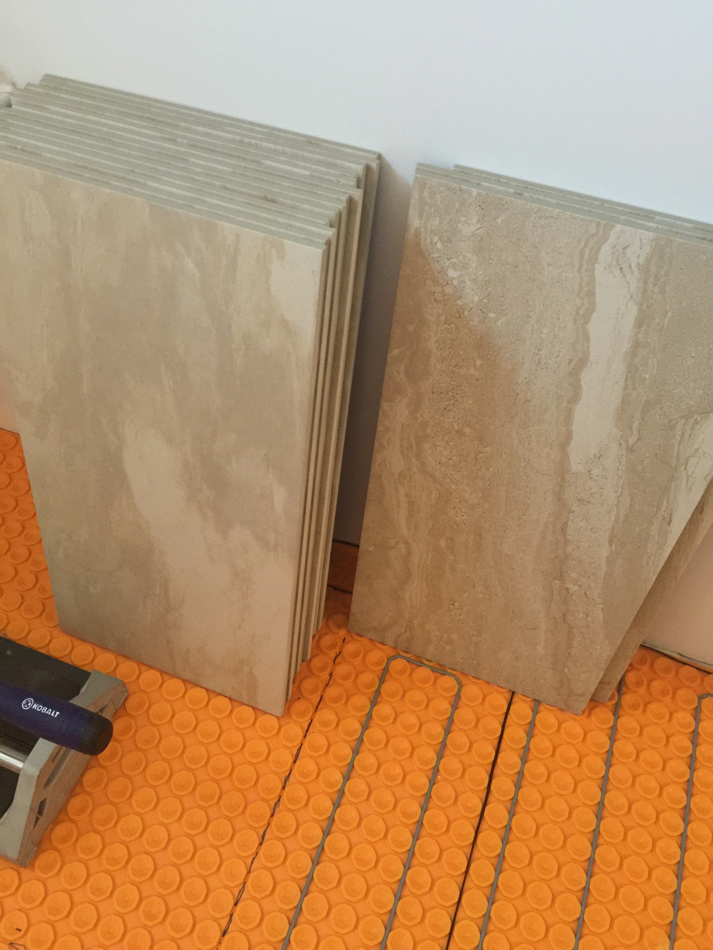 Starting the layout. A 1/3 offset minimizes the lips from the natural bow in the tiles. The gray wire is the floor warming cable.