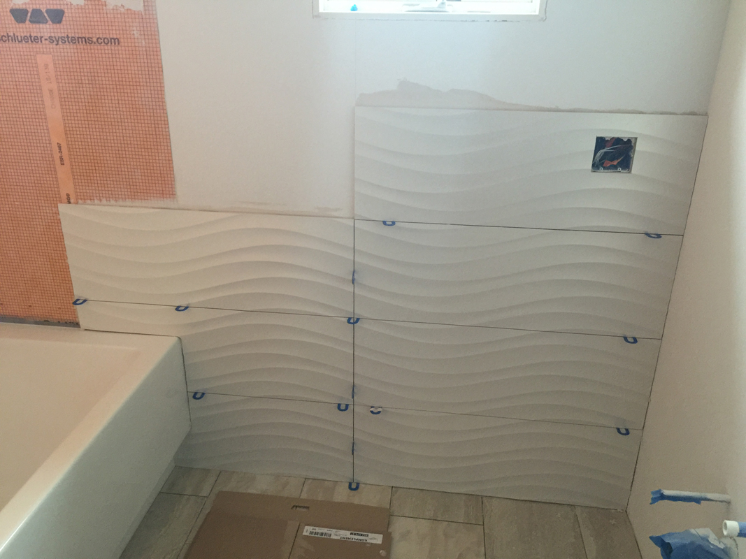 Once the floor was complete, I moved on to the walls. The tile we choose has been on our list for a long time. We actually ordered it sight unseen, which drove our salesperson nuts. She just couldn’t believe that anyone would order tile without having seen it in person, but we finally convinced her that it was what we wanted. It’s large format (12×36) so it goes on fast, but the pattern makes leaves little room for error. Plus, it’s only a 1/16-inch grout line, so the face plane has to be exact.