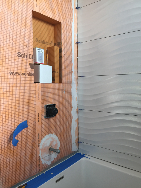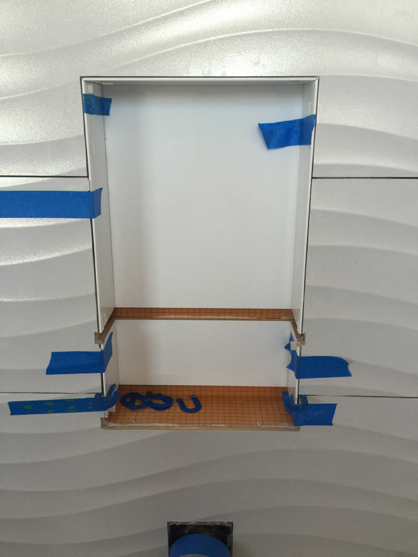 The last bit in this tile project that really tested me was the tile for the niche in the shower. Normally, you would have all the materials on hand to start this tile, but in our case the shelves will be fabricated when the countertops get done by the stone people. So I had to plan for the shelves to go in after the fact.